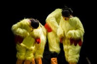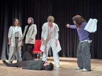 Die Inszenierung „Loop“ des Theater-WP-Kurses des Jahrgangs 11 unter der Leitung von Svenja Schreyer zeigte, wie Theater nach Edward Gordon Craig funktioniert. Das gezeigte postmoderne Marionettentheater unterschied sich besonders dadurch, dass es – anders als Dramen- oder Sprechtheater – nicht einer durchgehenden Handlung folgte, sondern einen Themenschwerpunkt setzte. In vier Gruppen spielten die Schüler/-innen verschiedene Szenen aus dem Alltag oder Situationen, die sich in Nuancen immer wieder veränderten. Die Schüler/-innen überzeugten mit ihrer ungewohnten und offen angelegten Vorstellung. Besonders gelungen waren die wiederholten Verläufe mit kleinen oder großen Änderungen, die sie jeweils mit gleicher Gestik spielten. Außerdem gelang es den Schüler/-innen trotz der Marionettengestik, die Situation und die Gefühle klar darzustellen, etwa durch große und expressive Bewegungen. Die Zeit als abstraktes Thema mithilfe des Marionettentheaters darzustellen, erforderte viel Können und Verständnis – beides war deutlich erkennbar. Zum Schluss lässt sich klar sagen, dass nicht nur das Publikum, sondern auch die Schauspieler/-innen sehr begeistert und motiviert waren.