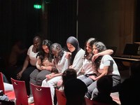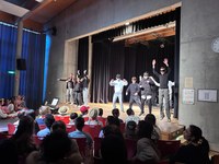 Plötzlich schubsten sich die Oberstufenschüler/-innen auf die Bühne und stritten sich, was sofort die Aufmerksamkeit des Publikums auf sich zog. Dieser Einstieg war kreativ und machte neugierig auf den weiteren Verlauf. Sharbano richtete folgende Worte aus dem Lied „Heal the World“ von Michael Jackson an das Publikum: „Think about – um – the generations and they say: 'we wanna make it a better place for our children, and our children's children, so that they know it's a better world for them', and they think about whether they can make it a better place“. Gesanglich überraschte auch der Chor. Die Stimmen passten gut zusammen und klangen insgesamt sehr harmonisch. Besonders die Soloparts fielen positiv auf, da sie nicht nur gefühlvoll und sicher waren, sondern auch sehr selbstbewusst gesungen wurden. Auch die Bühnenwirkung war stark. Die große Gruppe hatte eine überzeugende Ausstrahlung, sodass es nicht nur angenehm war zuzuhören, sondern auch interessant zuzuschauen. Insgesamt war der Auftritt gelungen und blieb durch die Mischung aus kreativem Einstieg und gutem Gesang im Gedächtnis.