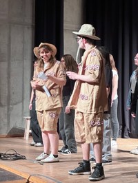 Die Moderator/-innen Fenja (S2-CUPID) und Tom (S2-ZEIT 1) in ihren Rollen als neugierige Archäologen eröffneten schwungvoll den 14. K-Abend, der sehr gut besucht war: Alle Plätze waren besetzt.