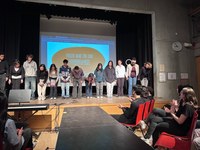 Zuletzt stellten die S4-Schüler/-innen des Profils CUPID ihren Reel-Prozess, ihr Ergebnis, ihren NDR-Beitrag sowie das Ergebnis der Gewinner der Lenz-Challenge in einer kurzweiligen Präsentation vor. Diese war schlüssig aufgebaut und langweilte die Zuschauer:innen nicht, die aufmerksam zuhörten. Außerdem zeigten die S4-Schüler/-innen dem Publikum ein Ringlicht und ihre Urkunde, die sie beide für den 3. Platz in Hamburg erhalten hatten. Die Abiturient/-innen teilten den Erfolg mit der Schulgemeinschaft, herzlichen Glückwunsch!