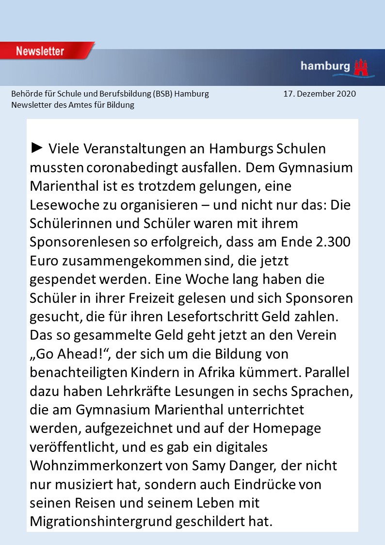 P.S.: Go Ahead! e.V. hat sich bei uns mit folgenden Worten bedankt: "Vielen Dank an das Gymnasium Marienthal! Ihr seid der Wahnsinn! Danke für die grandiose Spende!"